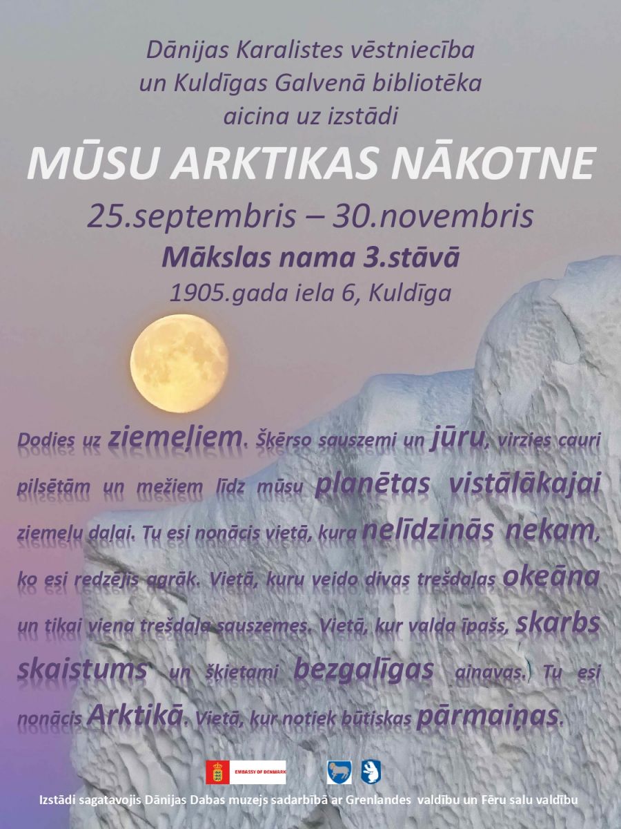 Izstāde "MUSU ARKTIKAS NĀKOTNE" 2025. g. 03. oktobrī ieteikt tvītot Dalies FOTO / VIDEO / PDF / POWERPOINT No 25. septembra līdz 30. novembrim Kuldīgas Galvenās bibliotēkas Mākslas nama 3. stāvā būs skatāma izstāde “MŪSU ARKTIKAS NĀKOTNE”, ko veidojis Dānijas Dabas muzejs sadarbībā ar Grenlandes un Fēru salu valdībām.