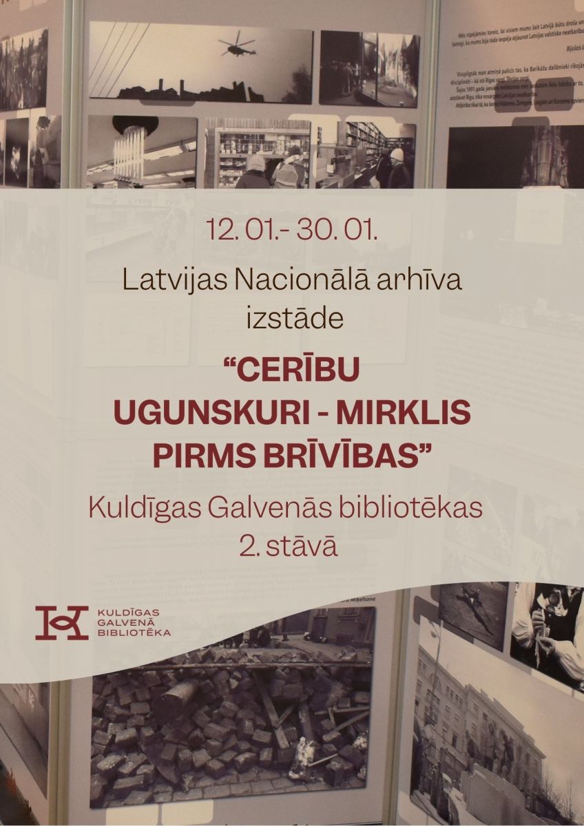 Latvijas Nacionālā arhīva izstāde “Cerību ugunskuri – mirklis pirms brīvības”, kas veltīta 1991. gada janvāra barikādēm, apskatāma no šā gada 12. līdz 30. janvārim Kuldīgas Galvenās bibliotēkas 2. stāvā.