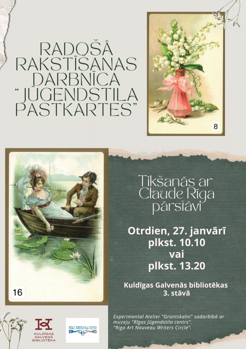 Aicinām uz radošo rakstīšanas darbnīcu un tikšanos ar "Claude Rīga" pārstāvi, kurš prezentēs šī gada konkursa pastkartes no Rīgas Jūgendstila centra kolekcijas.